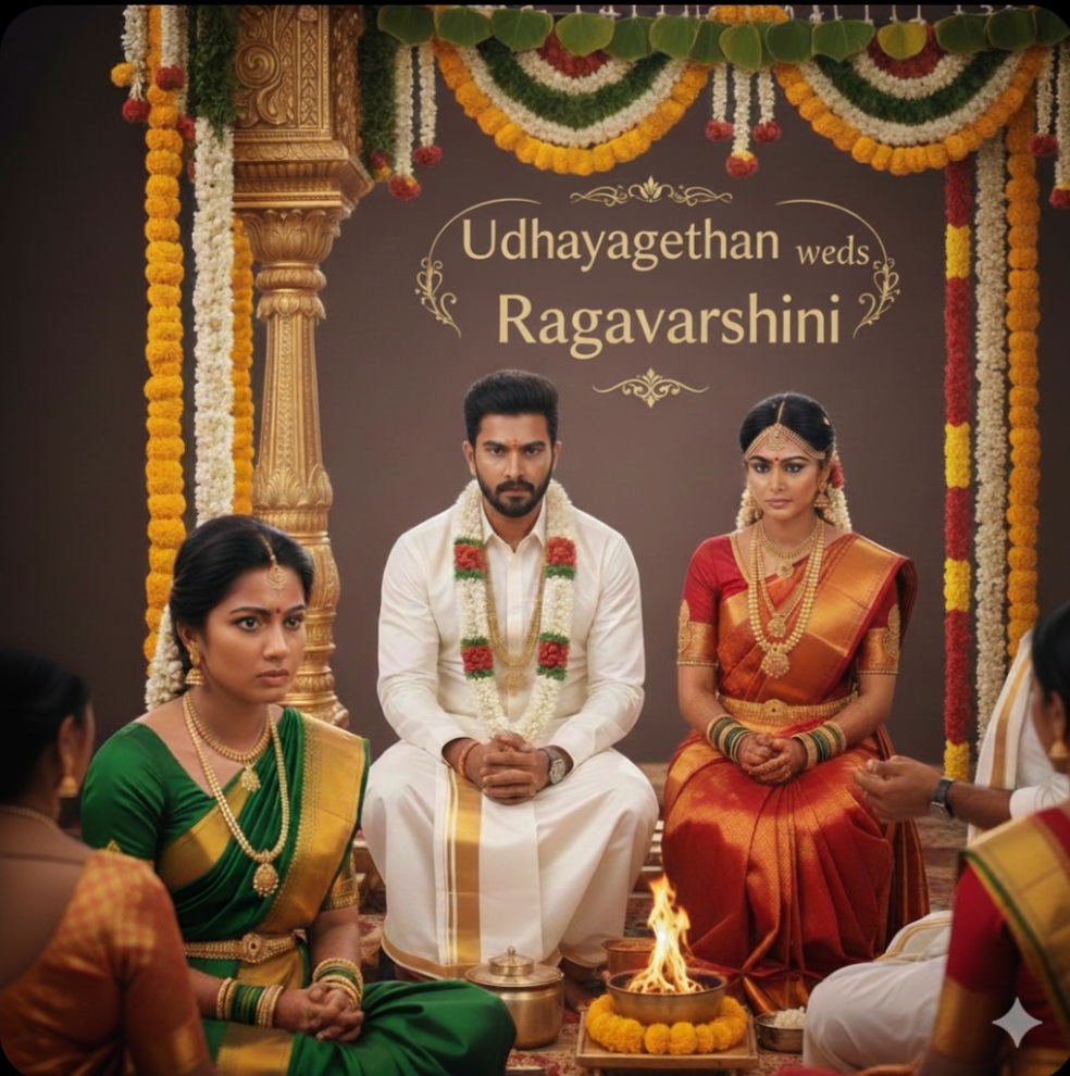 ‘ஹையோ, என்ன இது? எப்போ இவன் தாலி கட்டுனான்? அதுகூட தெரியாம இருந்துருக்கேனே!’ என்று மானசீகமாக தலையிலடித்துக் கொண்டவளின் பார்வையில் பட்டாள் மணப்பெண்ணாக தயாராகி இருந்த ராகவர்ஷினி.